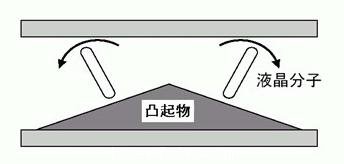 它叫做Protrusion的屋脊狀凸起物來使液晶本身產(chǎn)生一個預傾角(Pre-tilt Angle)。這個凸起物頂角的角度越大,則分子長軸的傾斜度就越小。早期的VA模式液晶凸起物只在一側(cè),後期的MVA凸起物則在上下兩端。