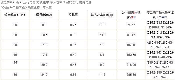 針對這一特殊要求制定方案,對其中兩臺對開電機進行開環變頻調速控制,配合兩臺全速風機,即滿足不同材料的溫控要求,又能節約電能。按照這一方案進行改造后,節電效果非常明顯。針對其中一種材料需固定頻率控制進行冷卻,幾個月才換一次,設定頻率在25—35之間,完全滿足冷卻要求。工頻下運行時一臺18.5KW風機(經變頻器輸出),每小時耗電為11.9度/小時,日耗電量為:285.6度/24小時。在正常運行時根據不同材料的溫度要求,設定頻率分別為:25Hz、30 Hz、35 Hz、40 Hz和45 Hz。運行測定參數如下: