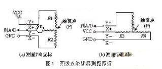 觸摸屏的兩個金屬導電層分別用來測量X軸和Y軸方向的坐標。用于X坐標測量的導電層從左右兩端引出兩個電極,記為X+和X-。用于Y坐標測量的導電層從上下兩端引出兩個電極,記為Y+和Y-。這就是四線電阻觸摸屏的引線構成。當在一對電極上施加電壓時,在該導電層上就會形成均勻連續的電壓分布。若在X方向的電極對上施加一確定的電壓,而Y方向電極對上不加電壓時,在X平行電壓場中,觸點處的電壓值可以在Y+(或Y-)電極上反映出來,通過測量Y+電極對地的電壓大小,便可得知觸點的X坐標值。同理,當在Y電極對上加電壓,而X電極對上不加電壓時,通過測量X+電極的電壓,便可得知觸點的Y坐標。測量原理如圖1所示。