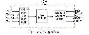 觸摸屏控制器有多種,主要的功能均是在微處理器的控制下向觸摸屏的兩個方向分時施加電壓,并將相應的電壓信號傳送給自身A/D轉換器,在微處理器SPI口提供的同步時鐘作用下將數字信號讀入微處理器。控制器ADS7846基本結構如圖2所示。