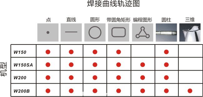機型 最大激光輸出功率 最大激光脈沖能量 主機耗電功率 冷水機耗電功率 W150 250W 20J/10ms 10KW 3.5KW W150SA 250W 30J/10ms 10KW 3.5KW W200 300W 30J/10ms 12KW 6.5KW W200B 300W 30J/10ms 12KW 6.5KW