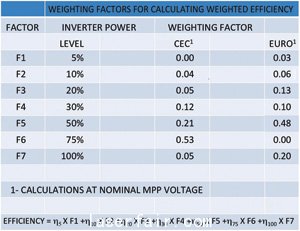 為了比較逆變器接近真實工作條件的效率,幾個社會團體已經提出了一種加權效率,用于在不同光照條件下衡量電能轉換效率。表1描述了加權系數和光照百分比之間的關系。