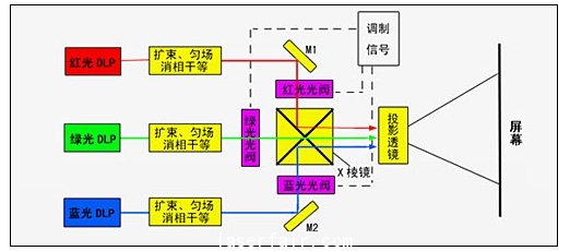 另一種彩色激光的原理也并不復(fù)雜,通過控制三色激光,構(gòu)筑整個(gè)色彩體系,這與CRT的原理一樣,不同的是,CRT通過控制不同的電子槍,實(shí)現(xiàn)不同的顏色表現(xiàn),而激光投影機(jī)直接控制光線,效率和效果都大大增強(qiáng)了。