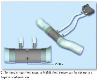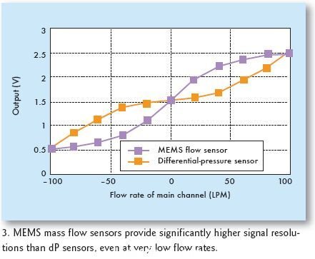 降低成本、減少空間、減輕重量的一個方法是在旁路通道設置低流量傳感器來測量主通道上較大的流量。MEMS流量傳感器旁路通道設置類似于差壓傳感器(間接測量氣體流量,見圖2).。與壓差傳感器相比,MEMS傳感器在很低流量情況下依然可以提供更高的分辨率。圖3描述了普通大流量傳感器與壓差傳感器之間的區(qū)別。在流量接近于零的情況下,壓差曲線變緩,難于判別該位置的流量究竟為零還是為負。