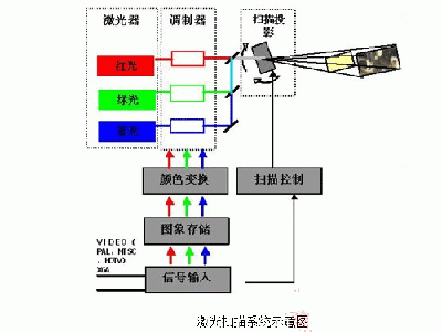 激光掃描LSD顯示,也叫做直觀式(點(diǎn)掃描)電視激光顯示,它是將經(jīng)過信號調(diào)制了的RGB三色激光束直接通過機(jī)械掃描方法偏轉(zhuǎn)掃描到顯示屏上。在最小顯示系統(tǒng)中,瞬間只有一個(gè)像素被點(diǎn)亮,系統(tǒng)通過快速分時(shí)的逐點(diǎn)點(diǎn)亮每一個(gè)像素點(diǎn),依靠人眼的視覺的時(shí)間誤差,形成一個(gè)統(tǒng)一的顯示畫面。