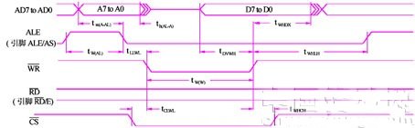 (2)sja1000讀寫邏輯分析及設計。由于sja1000的地址線和數據線是分時復用的,需要通過軟件編程模擬地址鎖存信號,以達到數據和地址的分時傳輸,因此,在程序設計中,要考慮sja1000的讀寫時序。圖4為sja1000的寫時序圖。