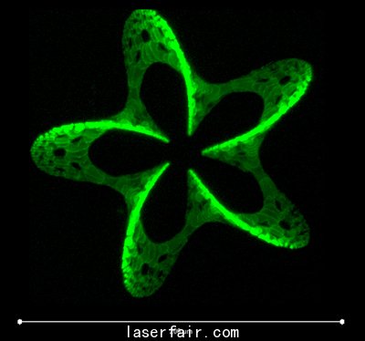由光接枝(180µm寬度)產生的三維模型。熒光分子附著在水凝膠上,產生了一個顯微三維模型。