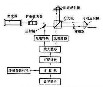 圖1為單頻激光干涉儀的工作原理。從激光器發出的光束,經擴束準直后由分光鏡分為兩路,并分別從固定反射鏡和可動反射鏡反射回來會合在分光鏡上而產生干涉條紋。當可動反射鏡移動時,干涉條紋的光強變化由接受器中的光電轉換元件和電子線路等轉換為電脈沖信號,經整形、放大后輸入可逆計數器計算出總脈沖數,再由電子計算機按計算式: