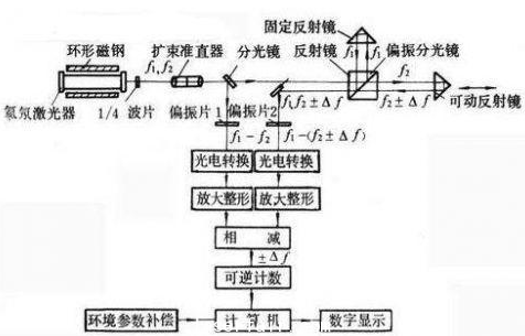 圖2為雙頻激光干涉儀的工作原理。在氦氖激光器上,加上一個約0.03特斯拉的軸向磁場。由于塞曼分裂效應和頻率牽引效應,激光器產生1和2兩個不同頻率的左旋和右旋圓偏振光。經1/4波片后成為兩個互相垂直的線偏振光,再經分光鏡分為兩路。一路經偏振片1后成為含有頻率為f1-f2的參考光束。另一路經偏振分光鏡后又分為兩路:一路成為僅含有f1的光束,另一路成為僅含有f2的光束。當可動反射鏡移動時,含有f2的光束經可動反射鏡反射后成為含有f2 ±Δf的光束,Δf是可動反射鏡移動時因多普勒效應產生的附加頻率,正負號表示移動方向(多普勒效應是奧地利人C.J.多普勒提出的,即波的頻率在波源或接受器運動時會產生變化)。這路光束和由固定反射鏡反射回來僅含有f1的光的光束經偏振片2后會合成為f1-(f2±Δf)的測量光束。測量光束和上述參考光束經各自的光電轉換元件、放大器、整形器后進入減法器相減,輸出成為僅含有±Δf的電脈沖信號。
