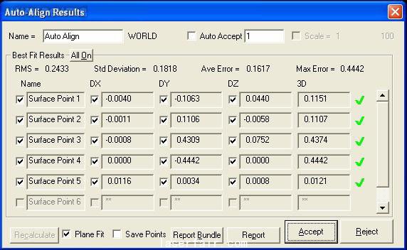 激光跟蹤儀像所有的三坐標測量設備一樣,提供了豐富的建坐標方式,除了傳統的三點建坐標、點線面建坐標、多點擬合坐標系等方式以外,還提供了一種獨特的復雜擬合建坐標方式,這種建坐標方式允許使用工件上的任意曲面、平面、定位孔、定位點組合起來作為建坐標的基準,擬合計算出工件坐標系。