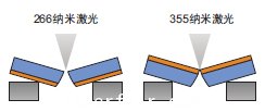 傳統上,單切是通過鉆石圓鋸旋轉進行刻劃(局部切割),再進行物理壓扣。但現在,大部分LED制造商已經轉而使用激光刻劃,再通過壓邊進行物理壓扣(見圖1)。圖中一束聚焦的紫外脈沖光束正在局部切割藍寶石。通常要多程切割晶圓厚度的大約30%(見圖2)。接著進行傳統的物理壓扣。