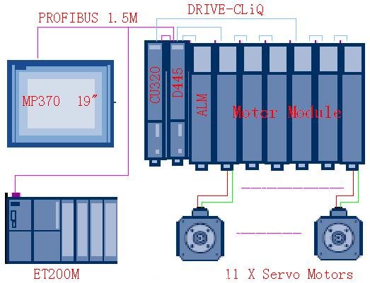 如圖所示,控制系統(tǒng)核心控制器為SIMOTION D445,通過擴(kuò)展CU320來實(shí)現(xiàn)完成11個(gè)伺服軸的控制,使用PROFIBUS DP作為通訊網(wǎng)絡(luò)連接各部件,涉及的其他部件及功能如下: