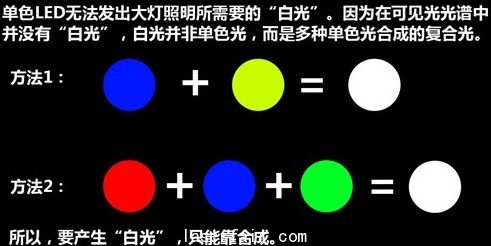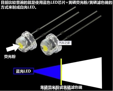 之前的LED是無法發出大燈照明所需要的“白光”的,因為在可見光光譜當中并沒有“白光”,它并非單色光,而是多種單色光合成的復合光。人眼看到的白光,需要藍色光+黃色光兩種波長光線的混合或是藍色光+綠色光+紅色光三種波長光線的混合(這就是彩電的三基色)。由于這兩種方法都需要藍色光,因此藍光LED就變成了開發白光LED的重要技術節點。