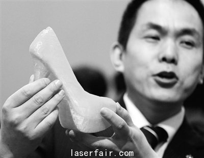 4月25日,工作人員在第六屆留交會上展示3D打印機打印出來的高跟鞋。當日,第六屆中國留學人員南京國際交流與合作大會在江蘇南京國際博覽中心舉行,現(xiàn)場展示的一款由3D打印機打印出來的塑料高跟鞋令參觀者大開眼界。