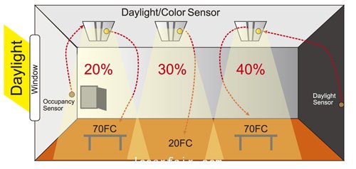 有鑒于上述能源法規嚴格限制企業、家戶耗電幅度,單純替換LED燈泡已難符合日益嚴苛的要求,因此,LED照明業者開始大力推廣可依環境自動調整亮度的智能照明控制系統,進一步提升LED照明系統的省電能力。Ghoshal指出,LED燈泡若能感測日光多寡程度,讓窗邊至墻邊的LED燈能依序調降20~40%的發光亮度,將能節省30%以上的電力(圖1)。