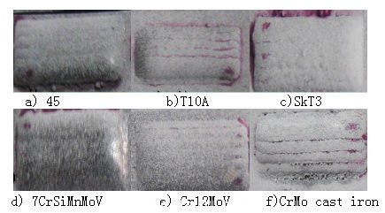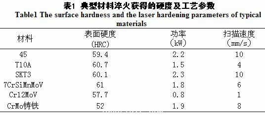 通過不斷的優(yōu)化實驗,得出了幾種有代表性的材料半導(dǎo)體激光淬火獲得的硬度及最佳的工藝參數(shù)如表1所示。