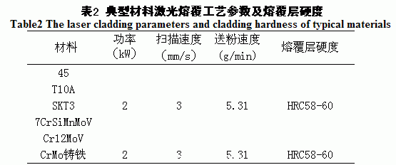 通過不斷的優(yōu)化實驗,得出了幾種有代表性的材料半導(dǎo)體激光熔覆的最佳的工藝參數(shù)如表2所示,激光熔覆層硬度HRC58-60。