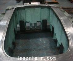 圖6汽車頂蓋拉延模,模具為Mo-Cr合金鑄鐵汽車頂蓋拉深模,激光處理前表面硬度為HRC40-45.由于拉深模工作表面硬度不夠,其工作表面易于工件產(chǎn)生粘著磨損,導(dǎo)致沖壓件被拉傷,生產(chǎn)過程中需要花費大量時間對模具工作型面進行推磨拋光,在線維修率達10%,經(jīng)激光表面強化后,模具表面硬度可提高到HRC58-62,處理后硬化層深度約為0.6-0.8mm,激光處理后模具使用壽命提高2-3倍,一次修磨拋光后的沖壓零件數(shù)已由原來300~500件提高到1000件以上,且激光淬火后的工件表面光亮,沒有任何氧化,后續(xù)機加工量非常小,大大節(jié)約加工時間和成本。