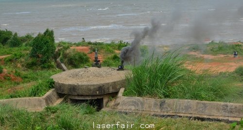 戰斗一開始就呈現激烈的態勢,由于紅軍是從海灘向模擬島嶼進行登陸作戰,進攻初期時傷亡較大,多處冒出紅色的煙霧,不斷有紅軍人員從戰場撤出。