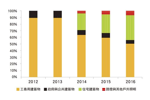 與LED照明發(fā)展初期相同,智能照明系統(tǒng)因?yàn)槌跗诮ㄖ贸杀据^昂貴,因此建置所能帶來(lái)成本下滑幅度多寡,變成消費(fèi)者是否采納的關(guān)鍵。由于辦公大樓、百貨公司、復(fù)合式商場(chǎng)以及量販店等,照明設(shè)備占耗電比重均達(dá)25~30%,因此工商用市場(chǎng)成為智能照明系統(tǒng)主要需求者。就2012年來(lái)看,工商用市場(chǎng)占比即接近90%,其次則是政策導(dǎo)向的政府與公共建筑,占比約在10%左右,預(yù)計(jì)住宅部分要等到2014年,相關(guān)產(chǎn)品價(jià)格大幅滑落后,占比才會(huì)有顯著增長(zhǎng)(圖3)。