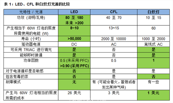 LED 照明高增長率背后的主要驅(qū)動(dòng)力是,與傳統(tǒng)照明方法相比,LED 照明的功耗大幅降低。與白熾燈照明相比,要提供同樣的光輸出 (以流明為單位),LED需要的電功率不到白熾燈的 20%。由表 1 可見,LED 照明還有其他很多優(yōu)勢(shì),但是也有一些與 LED 照明有關(guān)的挑戰(zhàn)。LED 照明的優(yōu)勢(shì)包括工作壽命比白熾燈長數(shù)個(gè)量級(jí),這極大地降低了更換成本。能利用以前安裝的 TRIAC 調(diào)光器給 LED 調(diào)光,也是一個(gè)主要的成本優(yōu)勢(shì),尤其是在住宅照明翻新應(yīng)用中。LED 能即時(shí)接通,不像 CFL那樣需要預(yù)熱時(shí)間,而且 LED 對(duì)電源循環(huán)不敏感,這一點(diǎn)也與 CFL 不同。此外,LED 不含任何需要管理或處置的有毒材料,而 CFL 需要有毒的水銀蒸氣才能工作。最后,LED 能實(shí)現(xiàn)新的和非常扁平的外形尺寸,這是其他技術(shù)不可能做得到的。