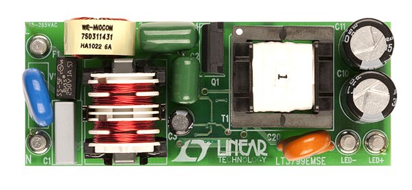圖 2:凌力爾特的 LT3799 離線式 LED驅(qū)動(dòng)器整合了單級(jí)有源濾波,以降低 EMI 并可提供一個(gè)數(shù)值達(dá) 0.98 的功率因數(shù) (頂視圖)。