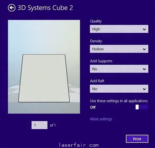 當用戶通過Windows 8.1打印3D模型時,在他們看來,整個過程就像打印Word文檔一樣簡單。在創建了3D模型之后,用戶便可以從Charms bar進入Device Charm。接下來,用戶可以從一個列表中選擇具體的3D打印機,隨后列表會列出所有打印選項,在點擊或觸碰“打印”按鈕,啟動3D打印程序之前,用戶還可以對這些選項進行調整。