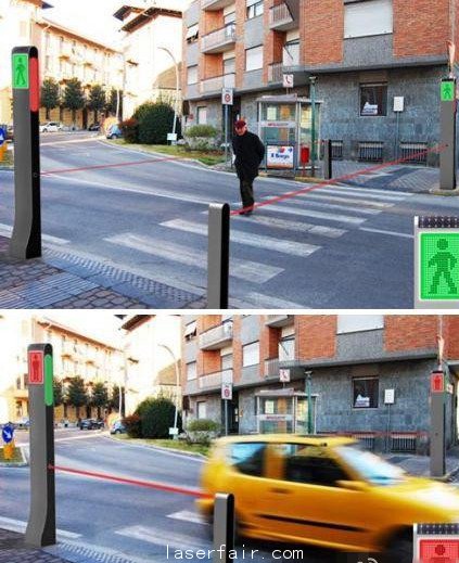 眾所周知,中國式過馬路就是聚齊一群人,不管是不是綠燈就可以過馬路,路上闖紅燈的人和車輛也是屢見不鮮,車禍慘劇每天都在上演。究其原因,一是個人安全意識不強,二是交通規則實施不到位。另外小編認為還有一個很重要的原因是紅綠燈的警示作用不夠強。現在有人發明了一種新的交通指示方法,由HOJOON Lim設計的紅綠激光束,為來來往往的行人與車輛提供多一層的安全防護。人行道的兩端立著4根柱子,會隨紅綠燈亮起發射兩條紅色的激光束:綠燈時攔截馬路,警示車輛;紅燈時攔截人行道,警示行人。由此起到更強的指示以及警示作用。