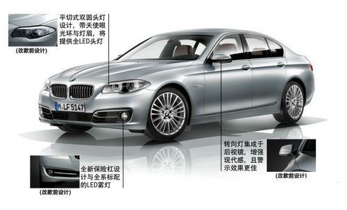 全新自適應LED大燈是新BMW 5系Li最易識別的外觀變化。嶄新的平切天使眼設計在近、遠光燈兩個扁圓光冠圓環中都使用LED發光單元的中心水平棱條,光冠底部運用削平設計,原有的白色燈眉和霧燈也運用了LED技術,獨特的樣式令動感倍增。