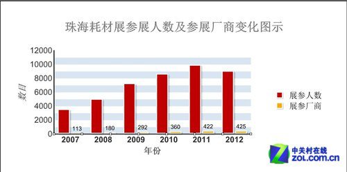 珠海耗材展在2007年舉辦的時候,只有113位參展商,參展人數(shù)只有3533人;到2012年的珠海耗材展上,參展商已有425位,參展人數(shù)已經(jīng)達(dá)到9035人,這是一個突破性的數(shù)字,這意味著在傳統(tǒng)打印市場,耗材問題備受關(guān)注。