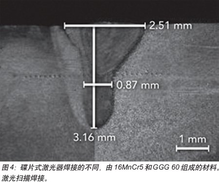 拼焊和疊焊在軸承制造方面的應用很多,它們都可以用碟片式激光器連接。圖3顯示了軸肩連接。3千瓦碟片式激光器可以實現(xiàn)3毫米的焊接深度,焊接速度為3米/秒。碟片式激光器能焊接出非常細的接縫形狀,因此它也能焊接不同的復合材料。圖4顯示了不同焊接的剖面圖,調質鋼(16MnCr5)被激光焊接成鑄鐵(GGG 60)。通常,人們可以期望在熔化帶大大提高強度,這會導致裂縫并影響焊縫。為了避免這種情況,需要使用填充金屬絲(NiBAS 70/20)來降低熔化帶的硬度,確保更同質化的焊縫。峰值的硬度和由此產生的裂縫是可以避免的。差別就是使用焊接速度為2米/分、3500瓦的碟片式激光器來焊接,穿透深度為~3.2 毫米。