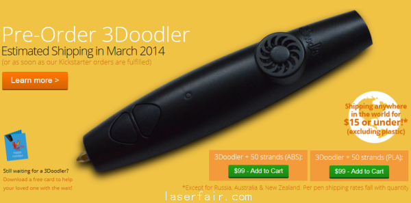 3Doodler去年在Kickstarter上舉行了一次成功的募資活動,如今該公司已經完成了對Kickstarter上所有訂購用戶的發貨。據3D打印資訊門戶天工社了解,現在WobbleWorks又開始接受預訂,預計發貨日期是2014年3月。而3Doodler外圍配件的定價和上市時間尚未最終確定,該公司希望能夠在今年春天出貨。