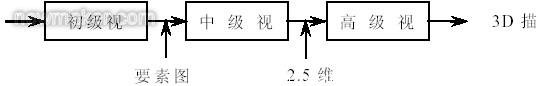 Marr 視覺計算理論立足于計算機科學,系統地概括了心理生理學、神經生理學等方面業已取得的所有重要成果。是三維掃描儀視覺研究中迄今為止最為完善的視覺理論。Marr建立的視覺計算理論,使計算機視覺研究有了一個比較明確的體系,并大大推動了計算機視覺研究的發展。人們普遍認為,計算機視覺這門學科的形成與Marr 的視覺理論有著密切的關系。Marr 視覺計算理論將整個視覺過程所要完成的任務分成三個過程,而獲得這些表示的過程依次稱為初級視覺、中級視覺和高級視覺,如圖1 所示。