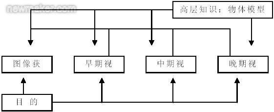 可以說.對三維掃描儀機器視覺的全球性研究熱潮是從20 世紀80 年代開始的,到了80年代中期,機器視覺獲得了蓬勃發展,新概念、新方法、新理論不斷涌現。有學者對計算機視覺理論的發展提出了不同的意見和建議。對Marr 的理論框架作了種種的批評和補充,綜合這些意見及補充可得如圖2 所示的框架。