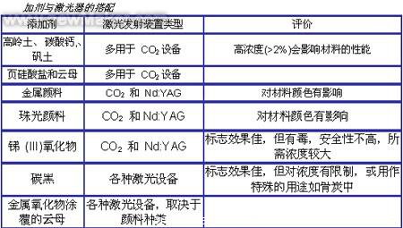 在激光標志技術中 最常用的添加劑有:金屬氧化物涂覆云母、粘土、滑石粉和銻、銅及其他金屬鹽。目前,Clariant、Engelhard、Merck、Ticona、 PolyOne以及Bayer等公司都能夠提供激光標志技術專用的添加劑、顏料及樹脂,而且許多供應商可以提供顧客所需的特定樹脂,里面混有用于激光標志的添加劑、顏料和著色劑。