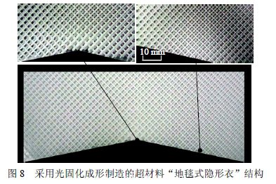 采用增材制造工藝,設(shè)計(jì)并制造了三維超材料試樣,如圖6 所示,試驗(yàn)測(cè)試結(jié)果表明,所制造試樣對(duì)特定頻段的電磁波能產(chǎn)生負(fù)折射現(xiàn)象[8]。研究發(fā)現(xiàn)了光子晶體負(fù)折射性隨微結(jié)構(gòu)和材料變化的規(guī)律,研究了三種微結(jié)構(gòu)形狀的光子晶體負(fù)折射性能,發(fā)現(xiàn)負(fù)折射的中心頻率變化范圍很小,測(cè)試結(jié)果如圖7 所示。正方形微結(jié)構(gòu)頻率寬度最大。認(rèn)識(shí)了各參數(shù)對(duì)光子晶體負(fù)折射性能的影響規(guī)律,為負(fù)折射特性光子晶體的主動(dòng)設(shè)計(jì)和制造奠定了基礎(chǔ),實(shí)現(xiàn)了傳統(tǒng)材料或結(jié)構(gòu)難以實(shí)現(xiàn)的電磁波傳輸性能,為未來(lái)的器件應(yīng)用提供了實(shí)現(xiàn)手段。以木堆光子晶體為基本的單元結(jié)構(gòu)形式,通過(guò)改變局部結(jié)構(gòu)單元填充比來(lái)調(diào)控其電磁參數(shù)(介電常數(shù)、磁導(dǎo)率),設(shè)計(jì)出了地毯式隱形衣(圖8)[9]、電磁黑洞等器件,實(shí)現(xiàn)了具有特殊功能的電磁波性能調(diào)控,研究成果將會(huì)推動(dòng)超材料從前沿研究向?qū)嶋H應(yīng)用發(fā)展。