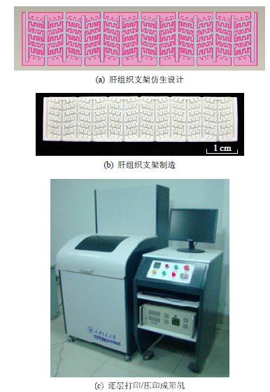 本課題組研制了適合微結(jié)構(gòu)成形的逐層壓印疊加成形裝備,實(shí)現(xiàn)了壓印工藝的自動(dòng)化增量成形,成形平臺(tái)達(dá)到250 mm?50 mm,定位精度達(dá)到0.1 mm。在對(duì)肝組織結(jié)構(gòu)分析的基礎(chǔ)上,設(shè)計(jì)了人工肝組織支架的仿血管樹[15]和仿肝小葉兩種仿生結(jié)構(gòu)[16],并對(duì)其微觀流道結(jié)構(gòu)進(jìn)行了流體分析,確立了最佳管徑比和最佳夾角。針對(duì)仿血管樹支架和仿肝小葉支架j構(gòu),研究并建立了仿生支架壓印卷裹成形和層疊成形工藝方法。最新提出的絲素蛋白/明膠材料的冰模壓印成形方法,消除了支架表面成膜的問(wèn)題,大大提高了支架微觀結(jié)構(gòu)的連通性,有效促進(jìn)了細(xì)胞的活性和擴(kuò)增[17](圖10[15])。