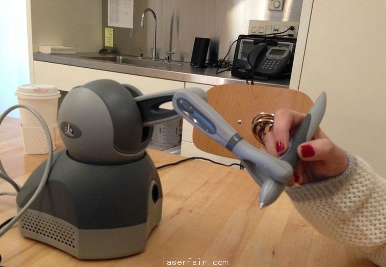 就是說,這個“鼠標”,當你在數字三維空間自由移動光標時不會感到任何阻力或反應力。但當你的3D“光標”碰到的正在建模的3D對象時,你握住觸控筆的那只手會突然感受到像自己真的用手觸摸一個實際物體的感覺。