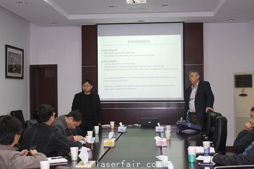 在學(xué)術(shù)交流上,青促會小組王俊介紹了Trinity College Dublin的發(fā)展歷史以及Prof. James Lunney在研究工作上的一些趣事。隨后,James Lunney教授作了題為Deposition of nanoparticle metal films using nanosecond and femtosecond lasers 的報(bào)告,與會人員就該研究成果進(jìn)行了熱烈的交流和探討。學(xué)術(shù)報(bào)告結(jié)束后,Prof. James Lunney 和Prof. Hongzhou Zhang在青促會成員的帶領(lǐng)下,參觀了高功率激光物理聯(lián)合實(shí)驗(yàn)室、強(qiáng)場激光物理國家重點(diǎn)實(shí)驗(yàn)室和中科院強(qiáng)激光材料重點(diǎn)實(shí)驗(yàn)室,雙方進(jìn)行了深入的交流,為日后可能的國際合作做了有效的鋪墊。