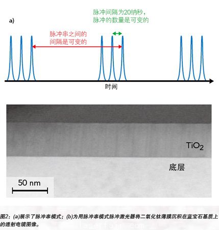 光纖激光體系可以直接從激光光源快速地輸出脈沖串,稱為脈沖串模式。例如,如圖2(a)所示,在進入放大階段之前,可以用聲光調制器從50MHz的振蕩器中篩選種子脈沖,最后輸出的是由多級脈沖組成的脈沖串,而且相鄰脈沖的間隔為20納秒。20納秒的脈沖間隔非常短,可以引起多重累積效應,包括靶標物的熱量以及燒蝕羽輝和緊隨其后的激光脈沖間的熱量,最終這將可以優化薄膜質量。圖2(b)展示了用這種方法沉積的TiO2薄膜。如圖中的透射電子顯微鏡圖(TEM)所示,薄膜的質量非常高,薄膜表面達到了原子級別的平滑程度,薄膜和基質間的界面也很平滑。用光學顯微鏡觀察100毫米的區域也沒有發現大的熔滴。