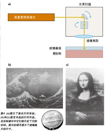 脈沖激光沉積的一種特殊變體是激光誘導反向轉移(LIBT)技術,可以應用于高分辨率的激光直寫。這項技術是用激光光束穿過透明的基質來燒蝕附近的靶標物。激光誘導蒸汽被反向推動到透明的基質上進行沉淀。LIBT技術在激光領域有著廣泛的應用。將超快光纖激光器用于這項技術,我們可以進行廣泛、連續的灰度范圍內的圖像打印,這只能在MHz級別的高重復頻率下實現。圖4(a)展示了這一體系。計算機控制的光束掃描儀根據原始圖像的灰度級別來改變光束掃描速度。高重復頻率會產生多脈沖的空間重疊,相應的沉積量也會累積,從而渲染出連續灰度的視覺效果。