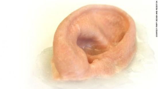 用活細胞在3D模具里培育出的耳朵。美國康奈爾大學的一個科研組正在進行一項不同的項目:利用包含活細胞的油墨凝膠打印患者耳朵的3D模子。打印的產品會被注入牛軟骨細胞和老鼠的膠原質,培育直至3個月后它們生長成成品。研究人員表示,人類有可能會在3年內開始移植這種假體。