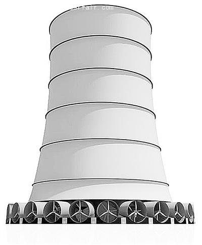 這座塔位于炎熱干燥的地區(qū)。其結(jié)構(gòu)是一個聳入云端的中空圓柱體,頂部開口以便驕陽炙烤過的干熱空氣進入。旁邊設有噴水系統(tǒng),可將水泵提送上來的水形成水霧噴灑到塔頂?shù)拈_放區(qū)域。當水分遇上干燥的空氣之后蒸發(fā),空氣迅速變冷,比重增加,由此形成垂直下沉的氣流,速度可達約50英里/小時。