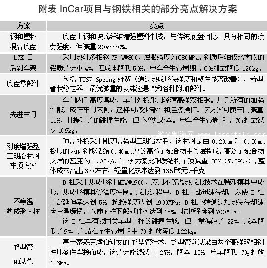 汽車解決方案。InCar項目(2008財年~2012財年)為汽車提供了車身、動力系統和底盤的創新解決方案,是蒂森克虜伯有史以來規模最大的汽車工程創新研發項目。自2009年啟動以來,蒂森克虜伯在歐洲和亞洲的14家工廠中開展項目研發,取得了30多項創新成果,引領了汽車結構的創新。其中InCar項目關于鋼鐵技術的部分亮點解決方案如附表所示。