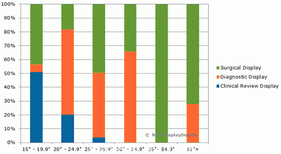 隨著放射性程序日益復(fù)雜,需要更多時(shí)間從顯示到讀取圖像,這將帶動(dòng)影像診斷顯示器(diagnostic display)的成長(zhǎng)。其中21.3”的顯示器已經(jīng)占有67%的市場(chǎng)率,并繼續(xù)主導(dǎo)此一類別的發(fā)展。然而由于特殊的面板和背光的需求,只有少數(shù)廠家才有能力參與這個(gè)利基市場(chǎng)。不過(guò)這些廠家以一些舊的低效率的產(chǎn)線進(jìn)行生產(chǎn),產(chǎn)能有限。因此生產(chǎn)這些面板的成本將會(huì)高于消費(fèi)性面板,樂(lè)觀地來(lái)看平均價(jià)格相對(duì)穩(wěn)定。
