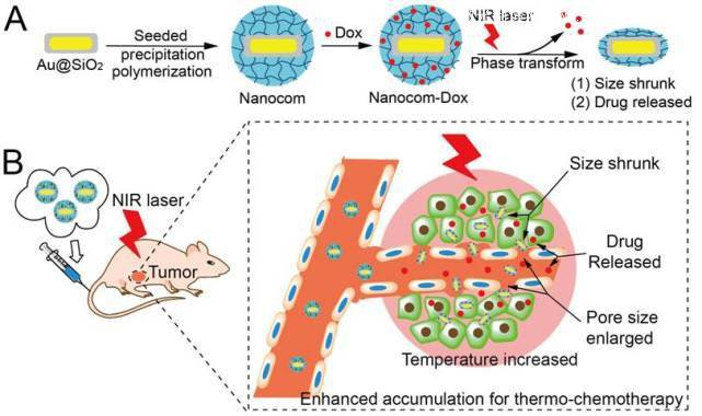 圖 1. 納米復合物Au@SiO2@polymer制備過程(A)與腫瘤靶向治療應用圖示(B)