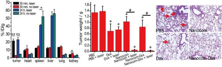 圖2. 納米復合物在激光照射下顯著富集于腫瘤組織,其產生的熱化療協同效應,有效抑制了腫瘤的生長與轉移。