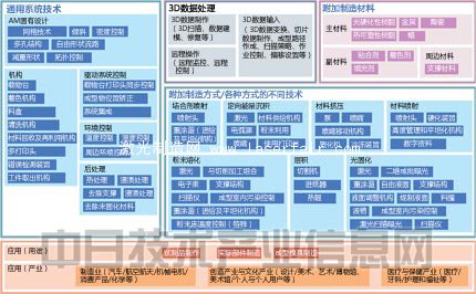 調查開始時制作的技術俯瞰圖如下(圖A)。調查大致分成附加制造材料、附加制造方式、同一方式下的個別技術、共通系統技術、應用(用途)、應用(產業)六個門類。但圖中的3D數據處理不在此次調查的范圍之內。