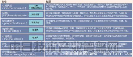 ASTM International把“附加制造(Additive Manufacturing)”方式分成了7個類別。名稱的右側標注了俗稱。