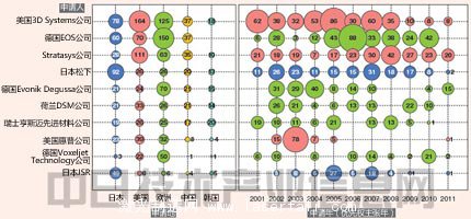 其中,美國3D Systems公司、德國EOS公司、在美國和以色列設有總部的Stratasys公司占了壓倒性優勢。日本企業中,松下位居第四(177件),JSR(72件)排到了第十。